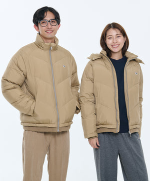ベージュの中綿ジャケットが優しく包み込む、リラックス感と上品さを兼ね備えた冬のカジュアルコーディネート。ホワイトのシャツをインナーに選ぶことで、清潔感をプラスし、全体の雰囲気を軽やかにまとめています。落ち着いたブラウンのパンツが、柔らかなジャケットとの色味の調和を取りつつ、シックな印象を引き立てます。足元にはブルーのアクセントが効いており、シンプルな中にも遊び心を感じさせます。黒のバックパックが実用性を加え、通勤やカジュアルなお出かけにもフィットするスタイルに仕上がっています。