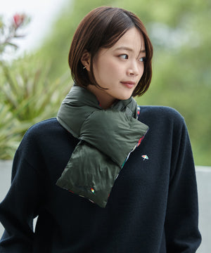 首元にはダウンマフラーをプラスし、冬らしいボリューム感と暖かさを両立。足元はブラックのシューズで全体を引き締め、シンプルながらも上品さを演出しています。小物にはロゴ入りのトートバッグを合わせて、カジュアルさの中にもスタイリッシュな印象をプラス。