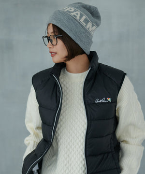 足元はグレーのサボシューズでナチュラルな抜け感をプラスし、ニットキャップでカジュアルさを引き立てています。小ぶりなロゴトートバッグがアクセントになり、日常使いにぴったりな実用性も兼ね備えたスタイリングです。