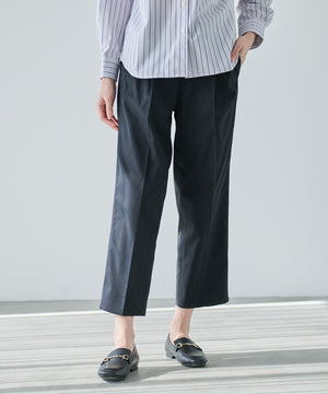シャツをタックインすることで、スッキリとした印象に仕上げています。 ボトムスにはネイビーのイージーパンツを取り入れ、リラックス感と上品さを両立。