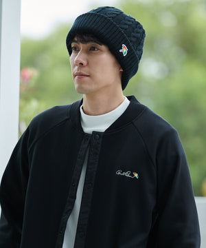 ネイビーのパンツはリラックス感のあるシルエットで、トレンドをしっかり押さえつつも快適な穿き心地。