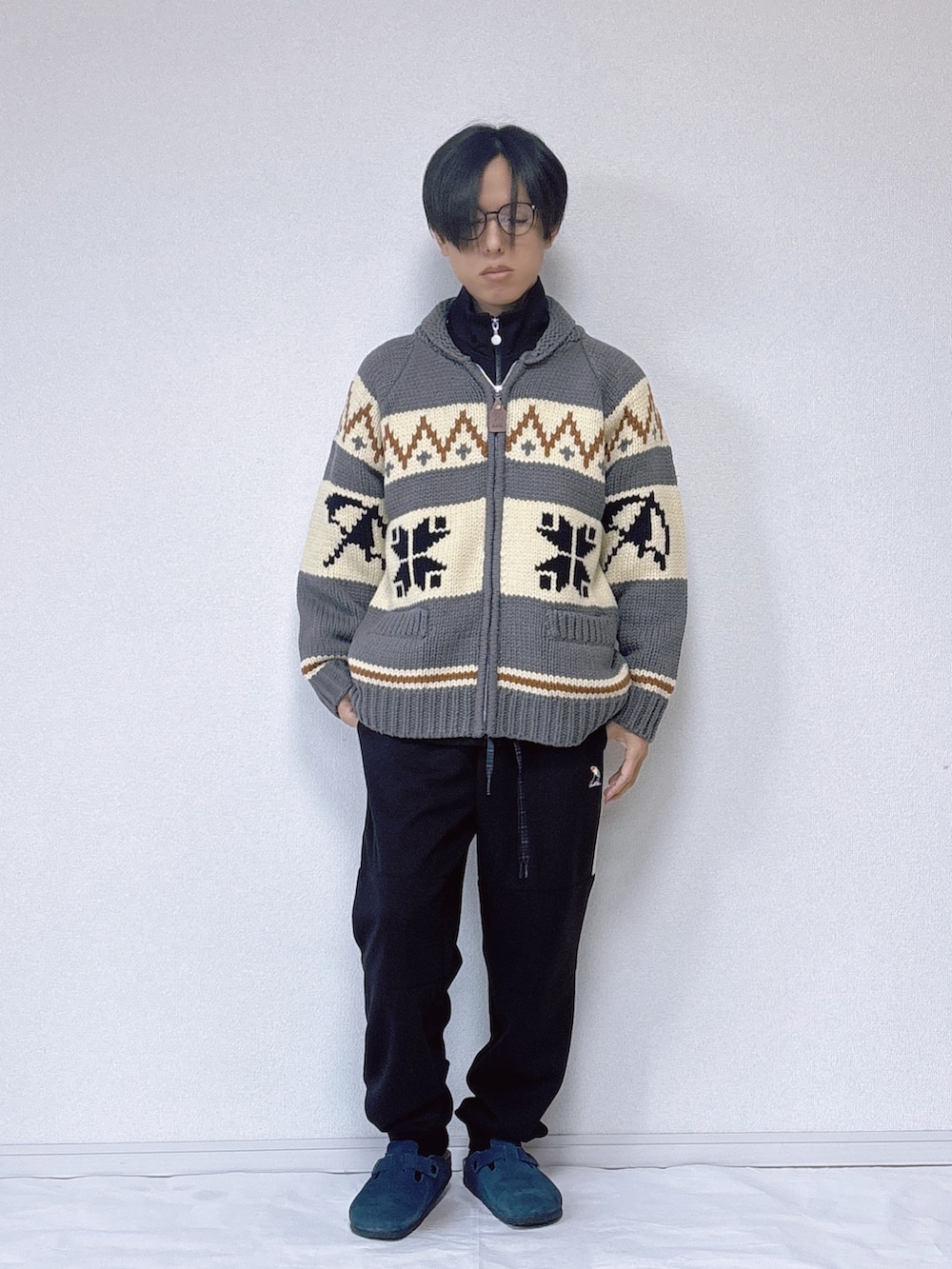 クラシックなカウチンジャケットを、あえてスポーティーなジャージー素材のセットアップに重ねたミックススタイル。 存在感のある柄ニットが主役になりつつ、インナーとボトムをブラックでまとめることで、全体はすっきりとした印象に仕上がっています。 カウチン特有の温もりと、ジャージーの動きやすさを両立できるので、リラックス感がありながらもこなれた雰囲気に。 普段使いはもちろん、ワンマイルや休日の外出にも取り入れやすいコーディネートです。