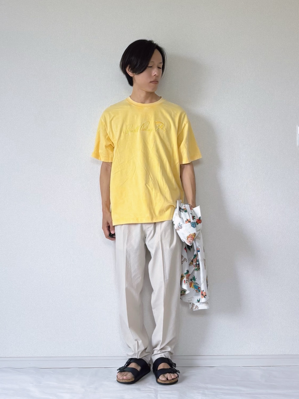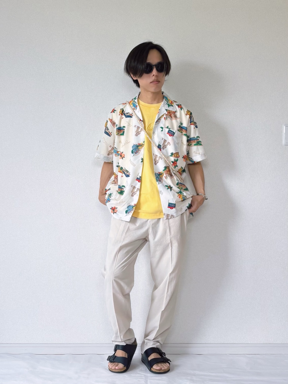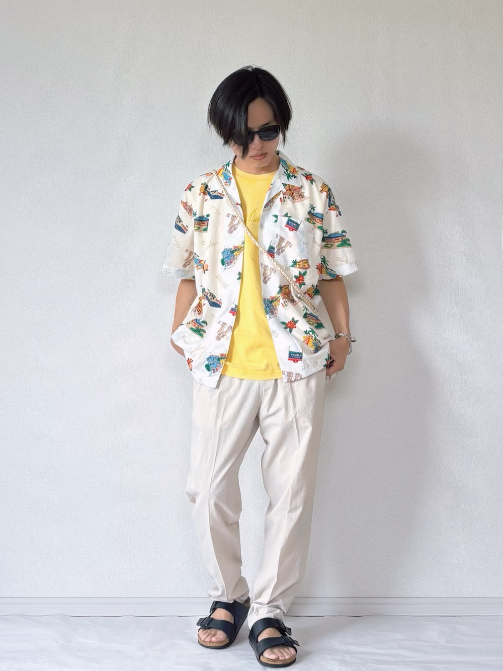 陽気な柄シャツを主役に、内側には爽やかなレモンイエローのロゴTを差し込んだ開放感のあるレイヤード。淡いトーンのパンツが全体に抜け感をプラスしつつ、サンダルで軽やかさも演出。ヴィンテージライクな柄とカラーリングで、夏の街歩きにも旅先にもマッチする遊び心あるスタイルに仕上げました。