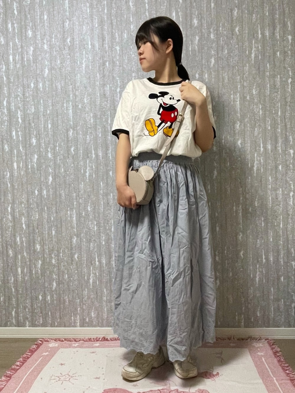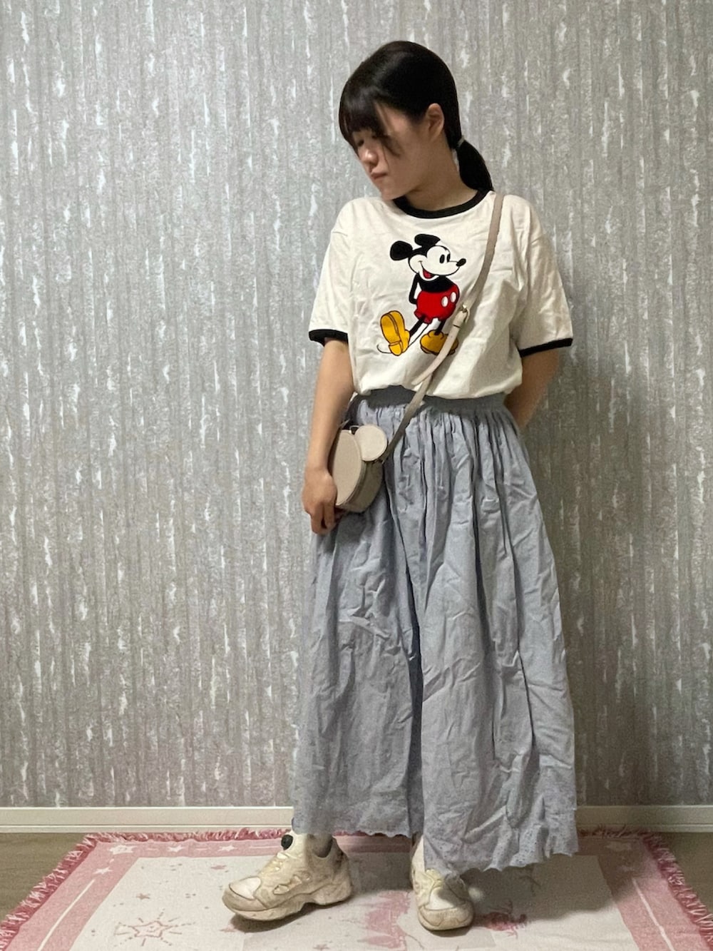 ライトベージュのミツマルショルダーをアクセントに加えて全体を優しくまとめ、足元のスニーカーで甘さを調整。