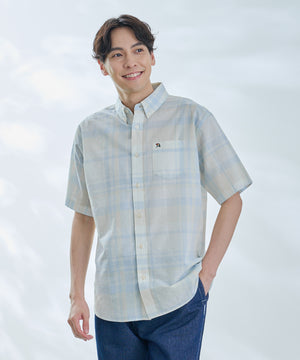 淡いブルーのTシャツに、さりげなく柄が入った半袖シャツを羽織ることで、シンプルながらも奥行きのあるスタイルに。清涼感のあるホワイトパンツが夏らしい爽快さをプラス。足元のブルースニーカーで全体を引き締めつつ、バッグでトラッドなアクセントを添えたバランスの良い着こなし。