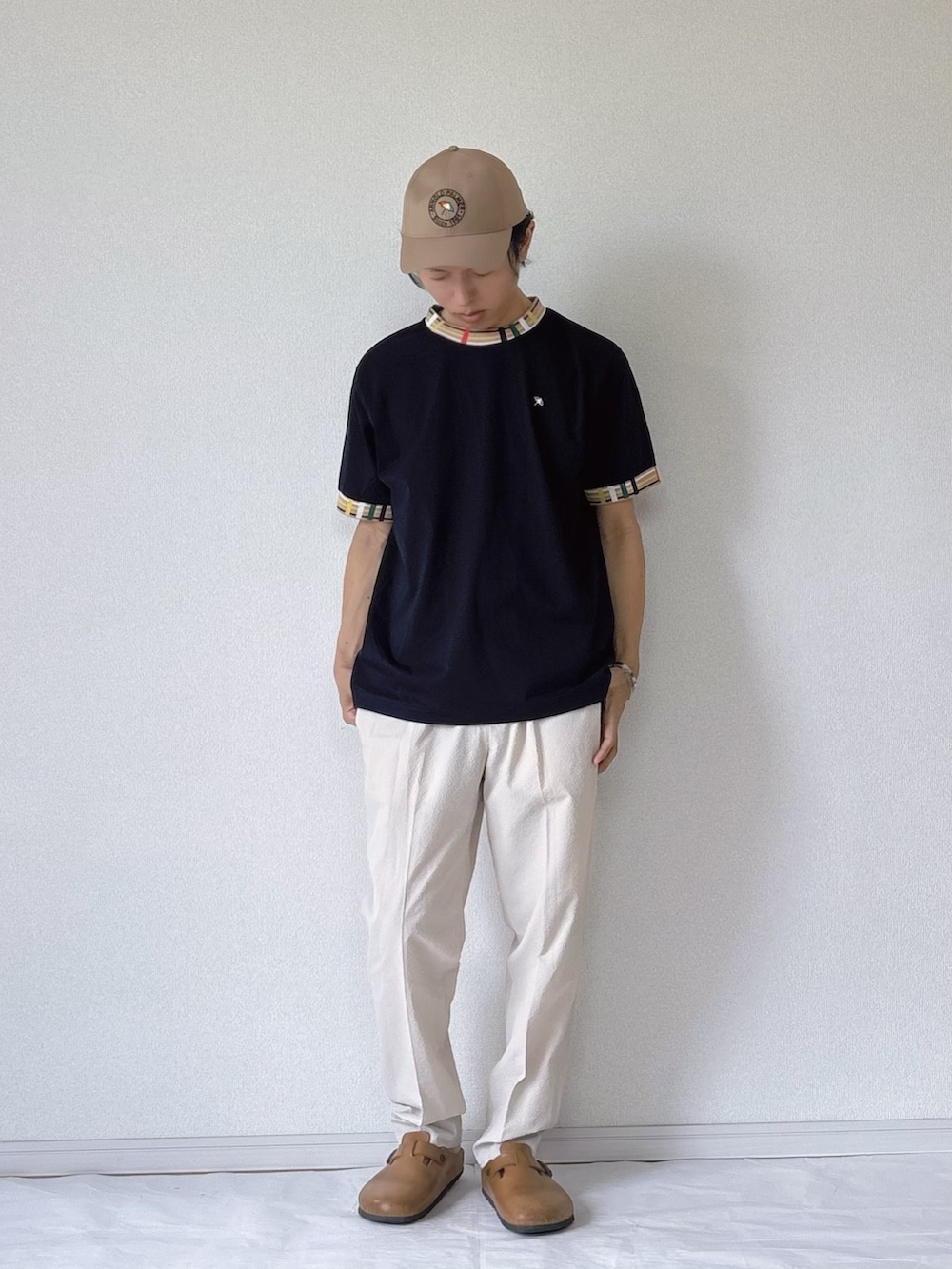ブラックのTシャツに白系パンツを合わせたモノトーンコーデに、襟と袖のチェック柄が遊び心をプラス。ベージュのキャップとシューズでトーンを統一し、抜け感のある大人カジュアルに仕上げました。ボディバッグを斜め掛けして、アクティブ感とスタイルアップのバランスも◎。