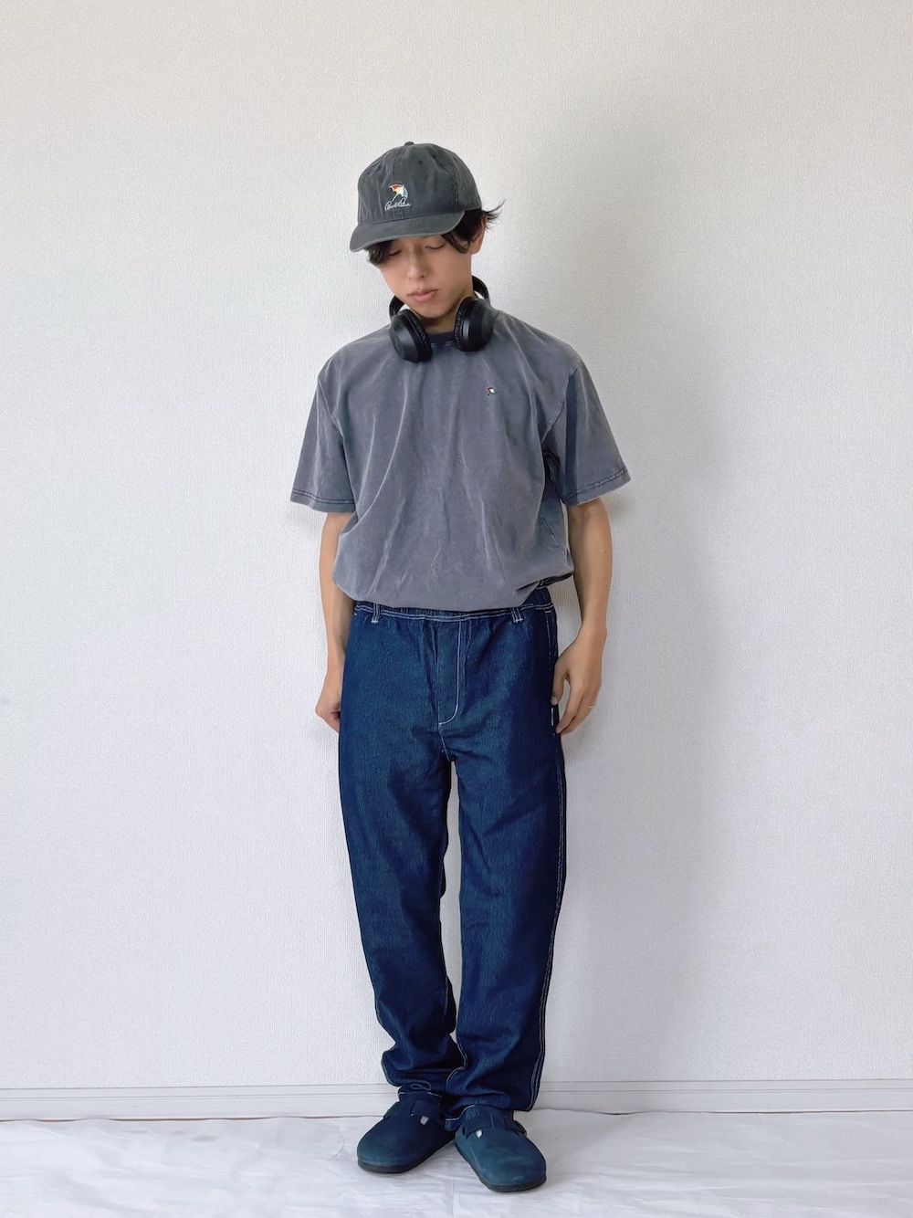 ヴィンテージライクなスミクロTシャツに、インディゴブルーのデニムを合わせた、奥行きあるワントーンコーデ。キャップとシューズも落ち着いたカラーで統一しつつ、ロゴ刺繍がさりげないアクセントに。ラフさと洗練さを兼ね備えた、大人のリラックスカジュアルです。
