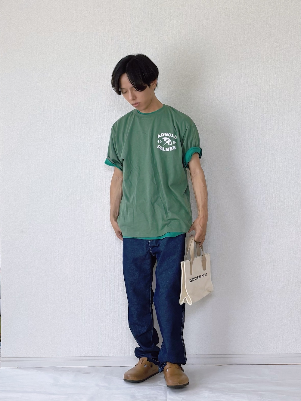 爽やかなグリーンのロゴTを主役に、インディゴデニムで王道カジュアルにまとめたスタイリング。Tシャツの袖と裾から覗く配色が、シンプルな中に遊び心をプラス。ナチュラルなトートバッグとブラウンのシューズが、全体に柔らかさと抜け感を与えています。気取らず洒落る、大人の夏カジュアルにおすすめ。