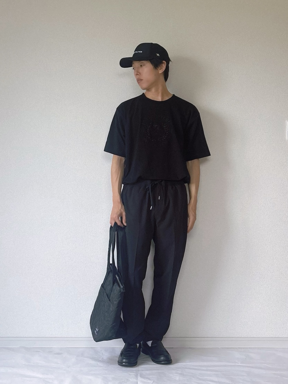 全身をブラックで統一し、シルエットの美しさを際立たせたクールな着こなし。キャップとトートバッグも同系色でまとめ、引き締まった印象を演出。小物を最小限にすることで、より洗練された大人のスタイルが完成します。