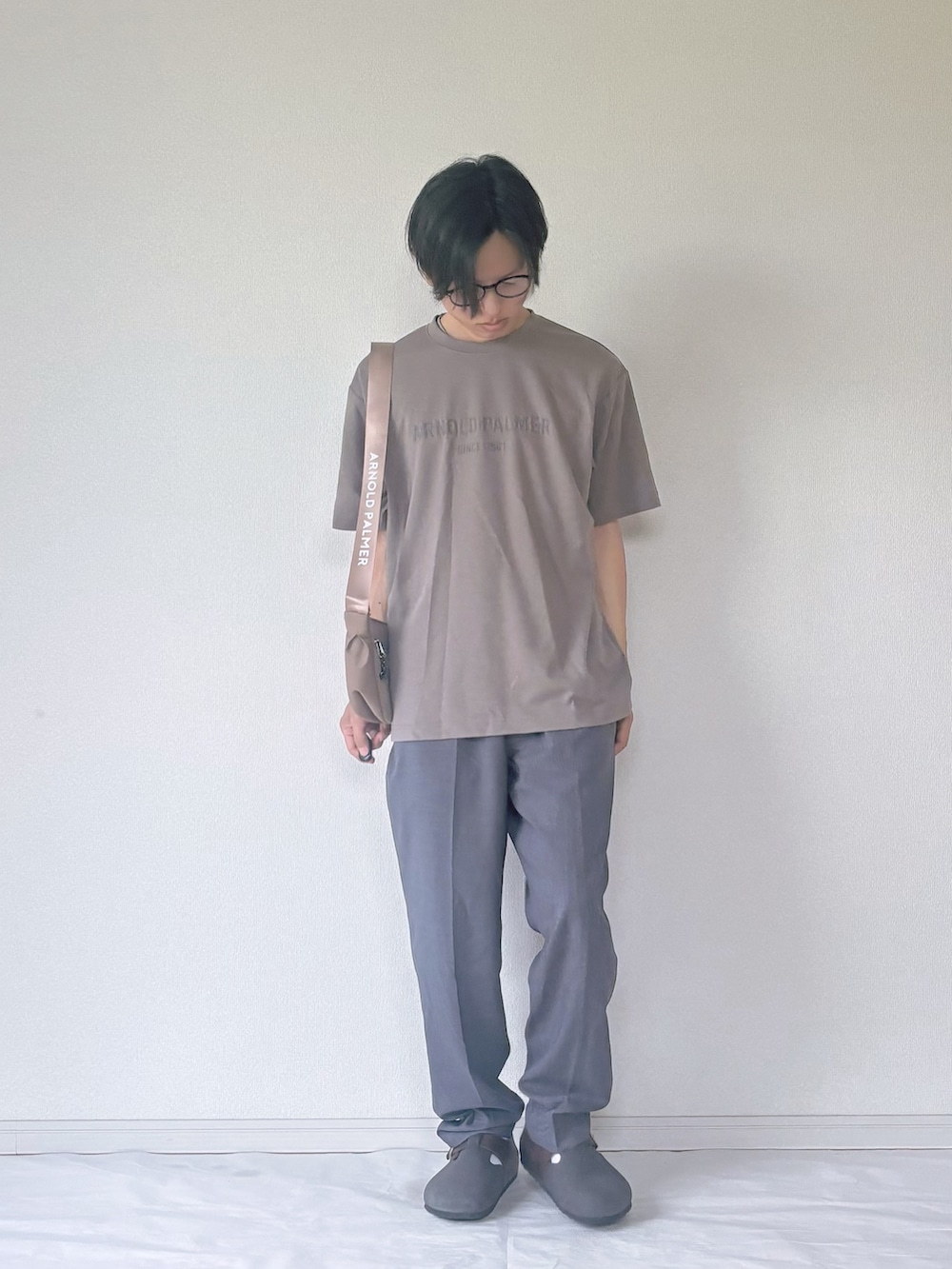 落ち着いたトープカラーのTシャツとグレイッシュなパンツを組み合わせた、柔らかく上品な配色コーデ。トーンを合わせたショルダーバッグが統一感を高め、足元のダークカラーシューズで引き締め。ラフさと大人らしさを両立したスタイル。