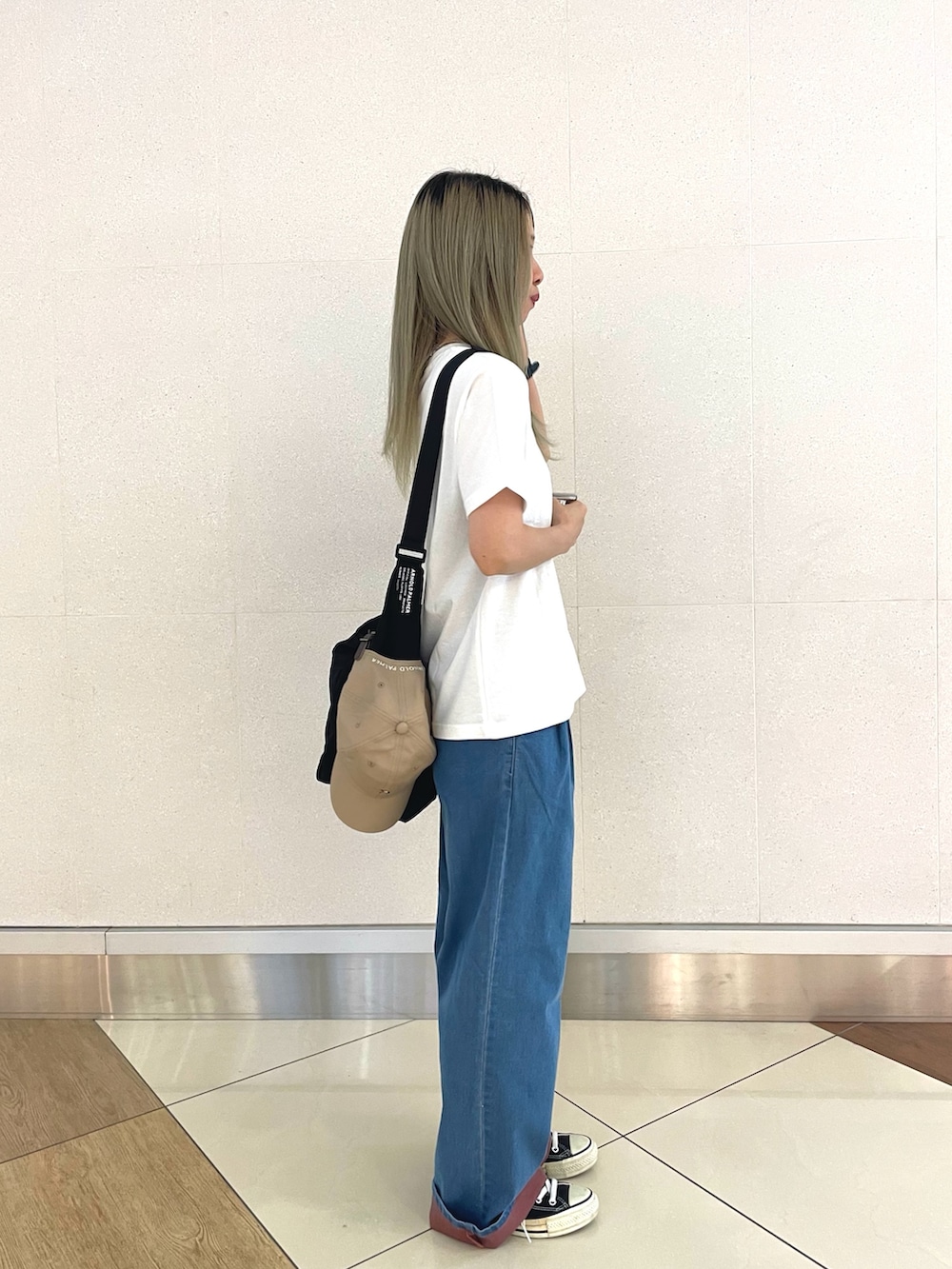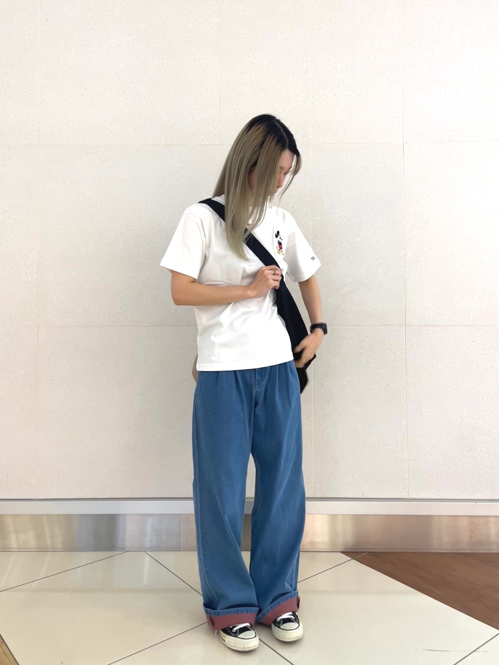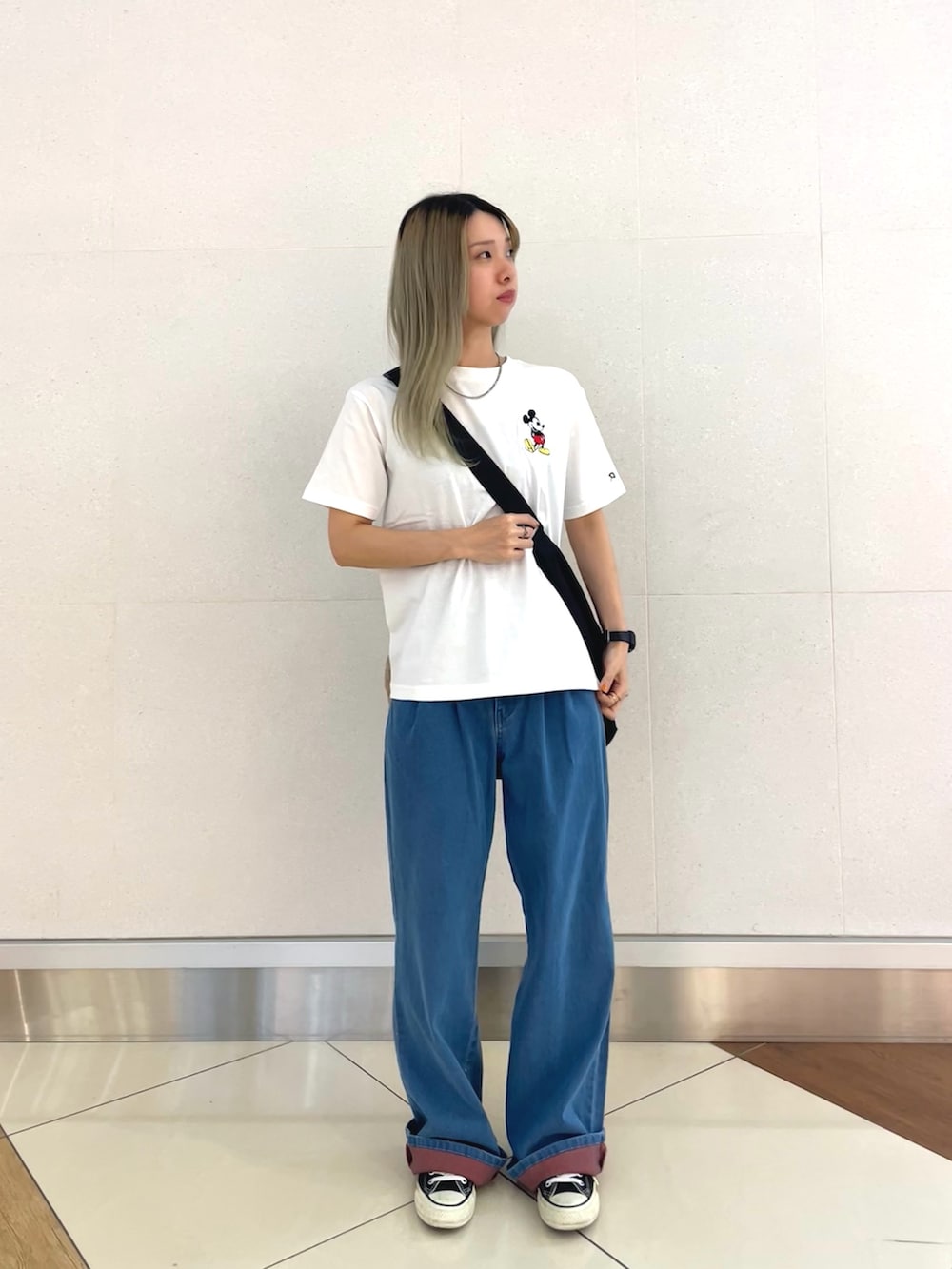 シンプルだけど遊び心あるスタイル✨ ミッキーマウスのワンポイントTシャツに、ゆったりデニムで気取らない感じが丁度いい。 スニーカーでさらにラフまとめてバッグを斜めがけするだけでちょっとのこなれ感も◎