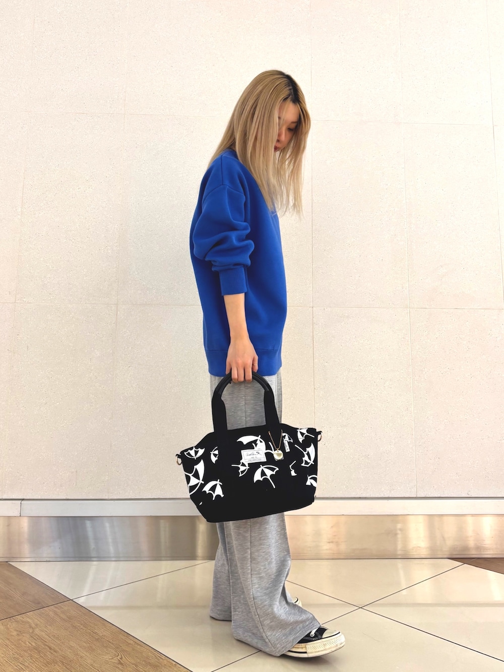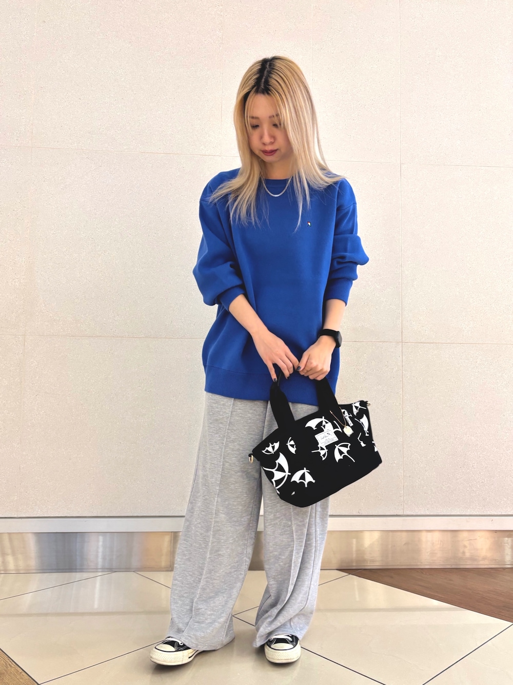 鮮やかなブルーが目を引くニットはシンプルでありながらも一枚で主役級になるアイテムです‼️ リラックス感のあるグレーのスウェットパンツと合わせ、ブランドアイコンである、傘マークが全体に散らばった存在感抜群のカバンをチョイスして遊び心をプラス♪ おでかけやカフェ時間にぴったりのコーデです^ ^