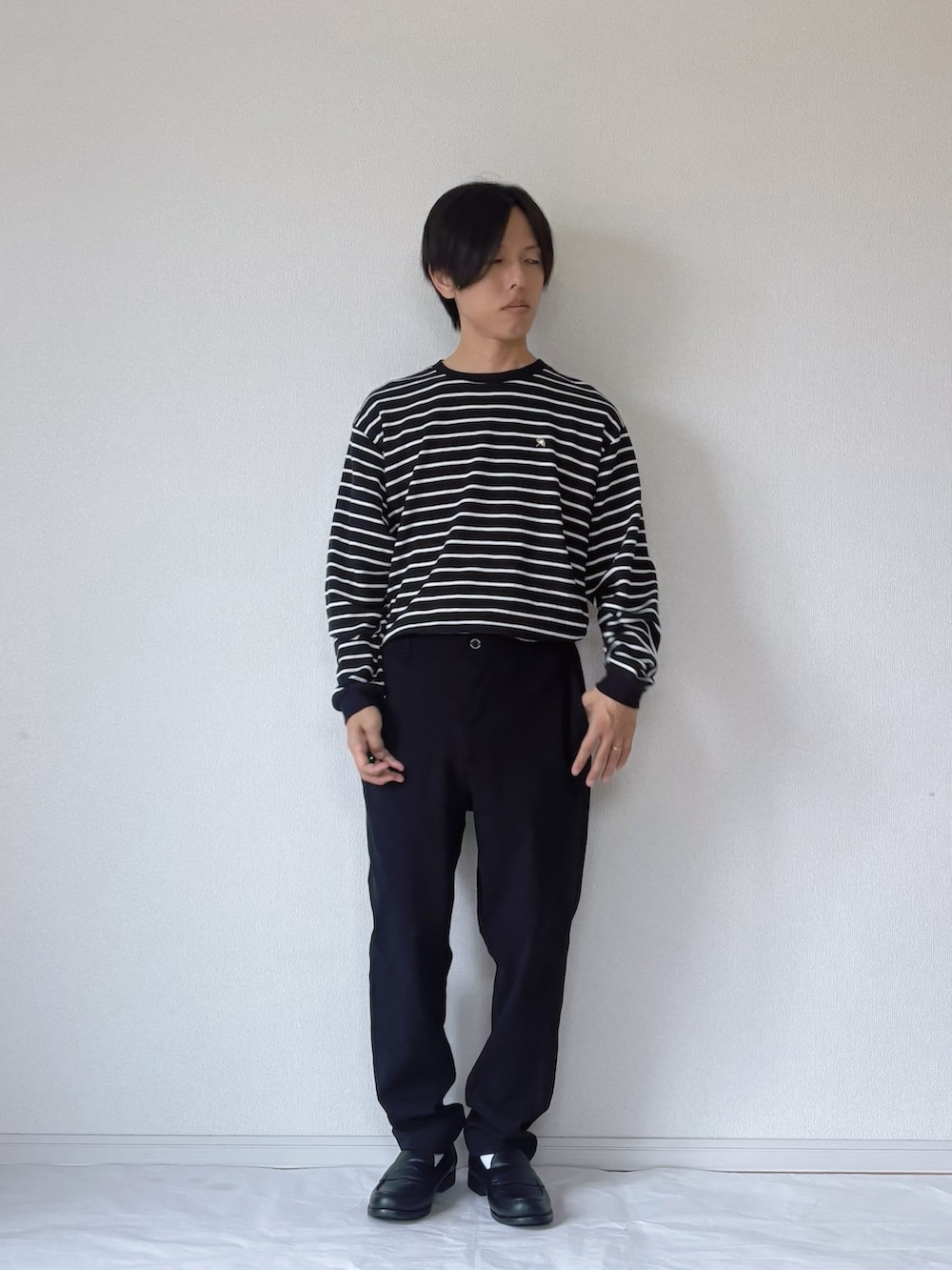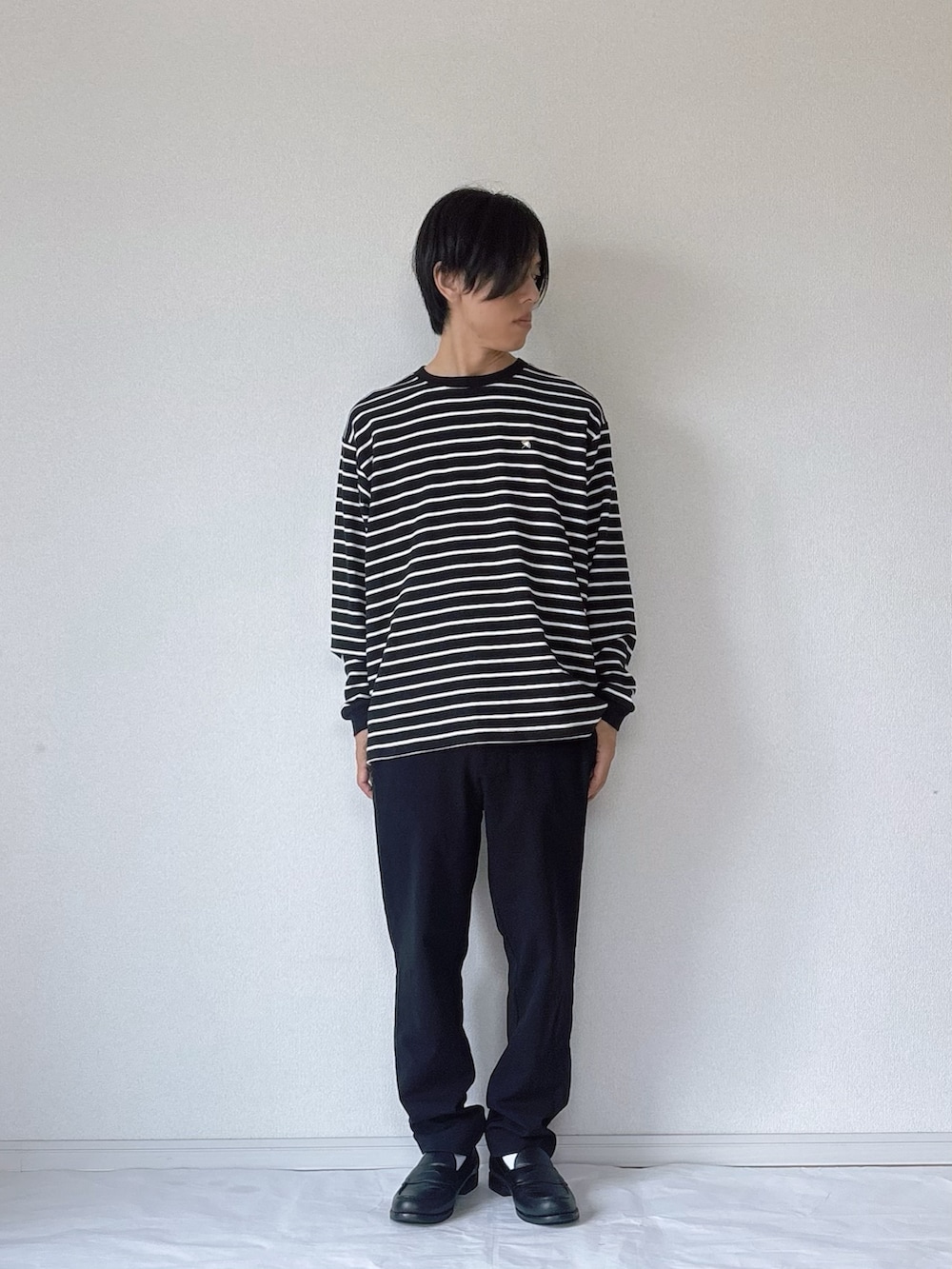 カジュアルで落ち着いたモノトーンコーデをご紹介します。 ブラックのジップパーカーに、インナーはボーダーカットソーを合わせて爽やかさをプラス。パンツとシューズも同系色でまとめることで、全体がスマートに仕上がっています。アクセントにはシンプルなショルダーバッグを取り入れ、普段使いしやすいスタイルに。 シックな印象ながらも程よいカジュアル感があり、ちょっとしたお出かけやリラックスしたい日のコーデにおすすめです。