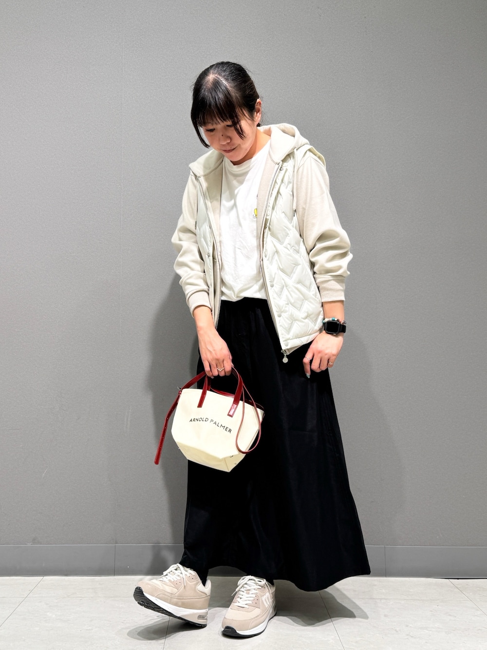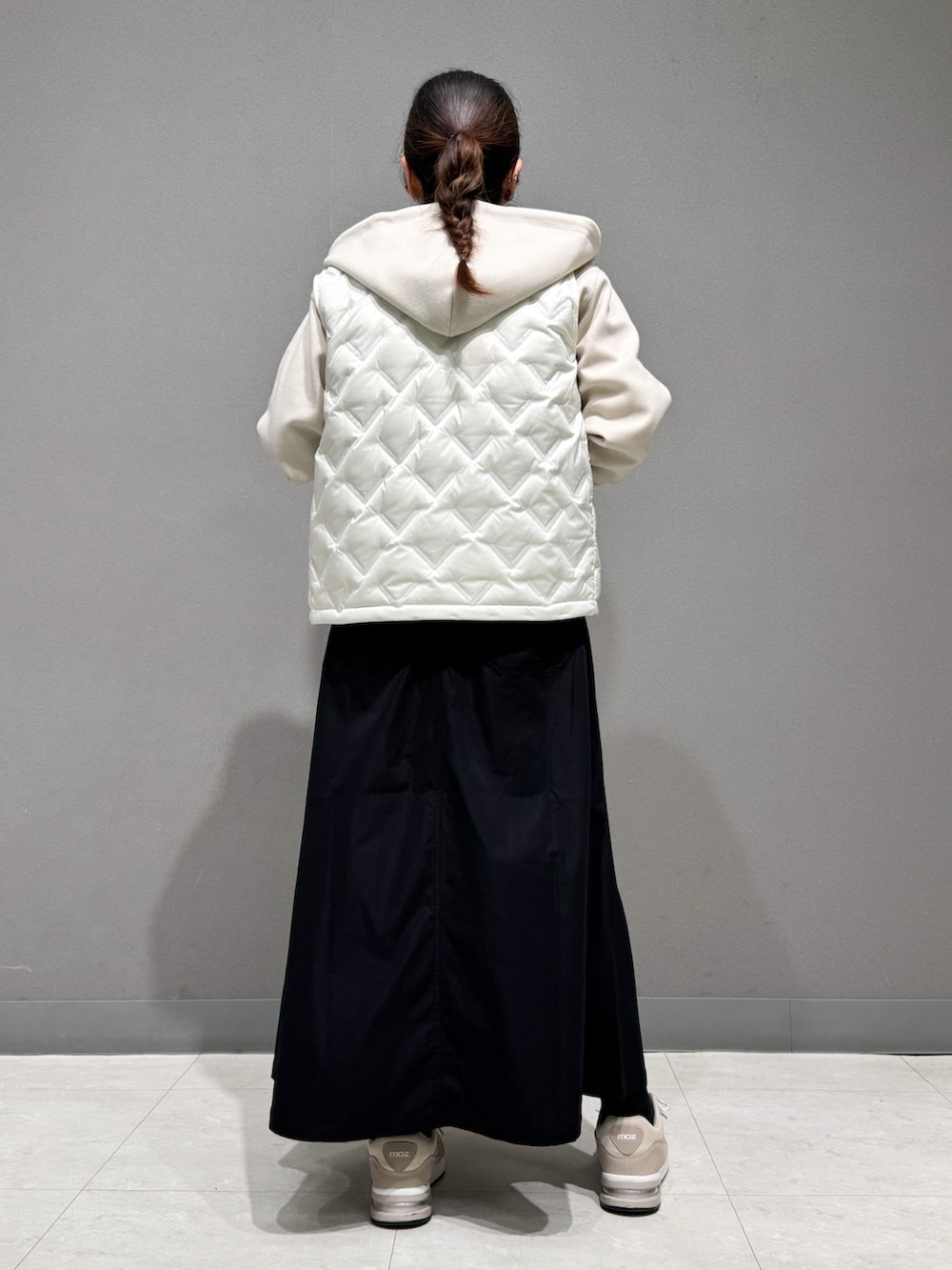 シームレス仕様のインナーダウンベストを使ったレイヤードコーデ! キルティング風のデザインでカジュアルにもキレイめにも◎