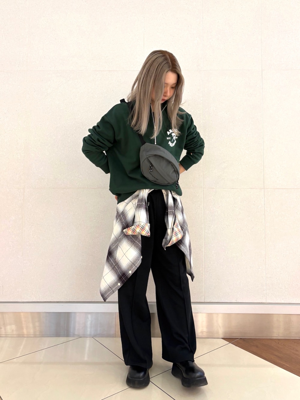 シンプルな色使いでもシルエットとレイヤードで差をつけ、チェックシャツを腰巻きする事でトレンド感や季節感もプラスした欲張りコーデ✨