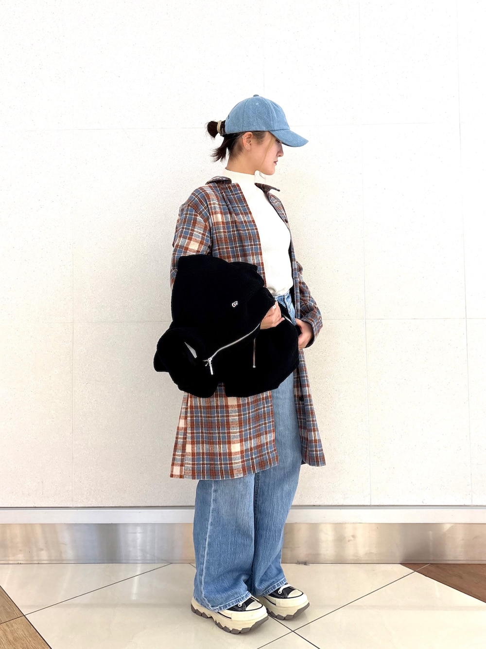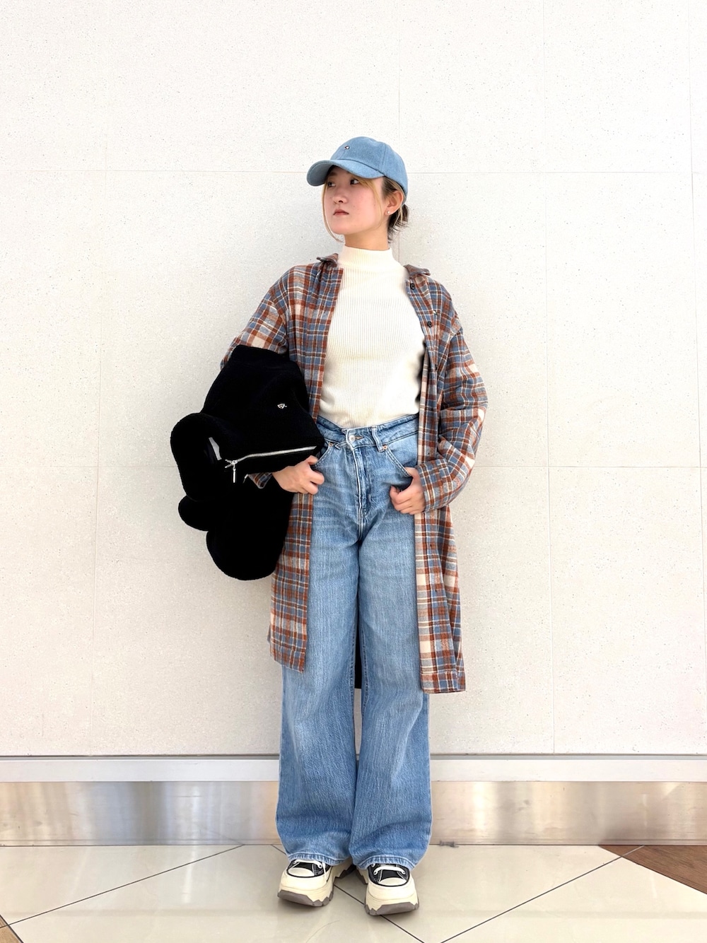 柔らかなトーンのチェックシャツワンピを主役に程よくラフさを残したカジュアルコーデ。 モックネックニットとデニムのシンプルな組み合わせに、ロング丈のシャツをさらっと羽織るだけで簡単にこなれた雰囲気に✨