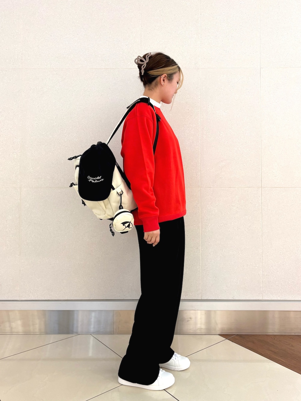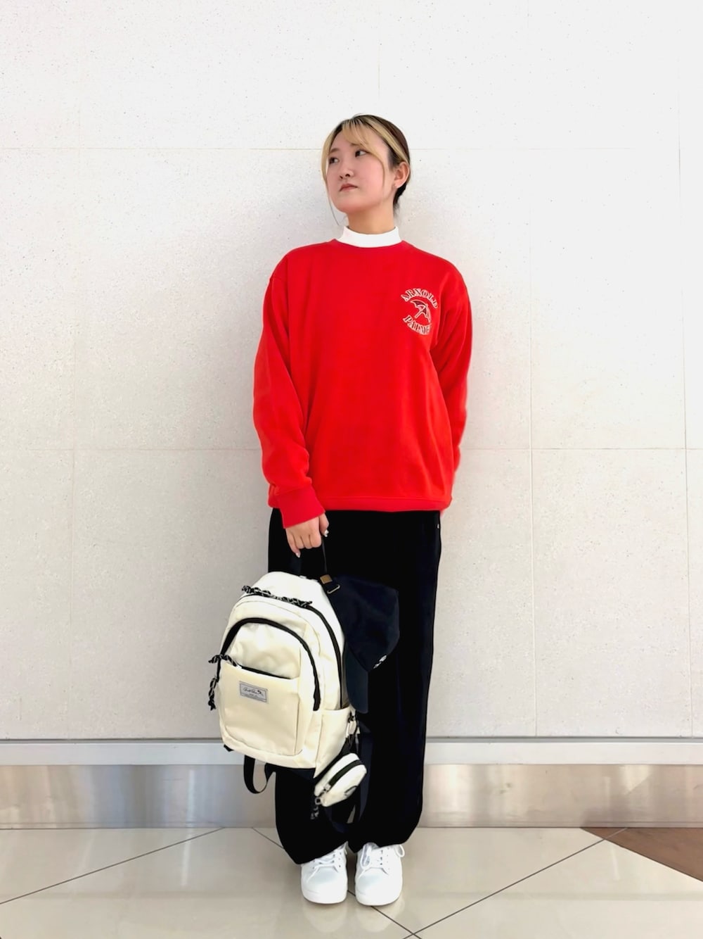 さっと着るだけで主役になる赤スウェットに白のインナーをちら見せして、抜け感のあるバランスに。 どのアイテムもデイリー使いしやすくおすすめです^ ^‼️