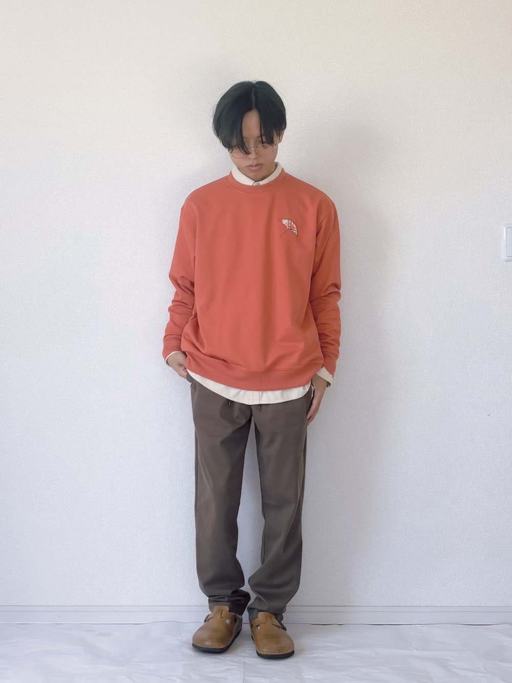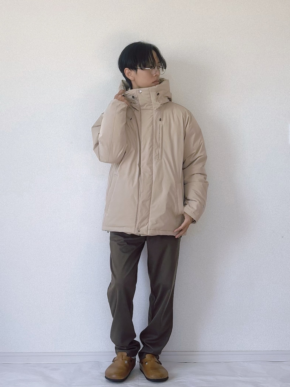 700フィルパワーのフードダウンジャケットを主役にした、軽さと暖かさを両立した冬コーデ。 上品なベージュのダウンに、モチーフトレーナーのオレンジを差し色としてプラスすることで、季節感のある華やかな印象に。 インナーにはコーデュロイシャツをレイヤードして、程よいカジュアルさと大人っぽさをミックス。 ボトムは落ち着いたブラウン系でまとめ、足元のレザーサンダルとリンクさせることで統一感のある仕上がりに。 柔らかくクリーンな色使いが冬の着こなしを新鮮に見せる、バランスの良いダウンスタイルです。