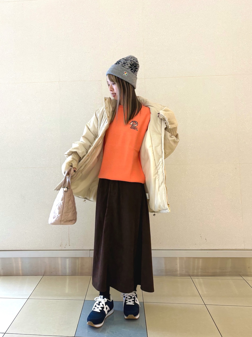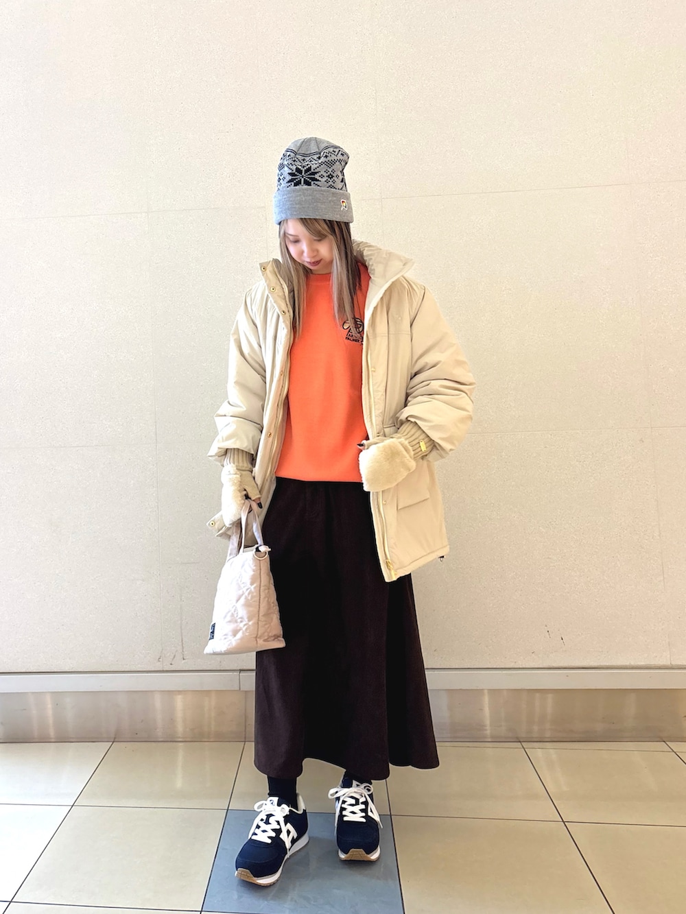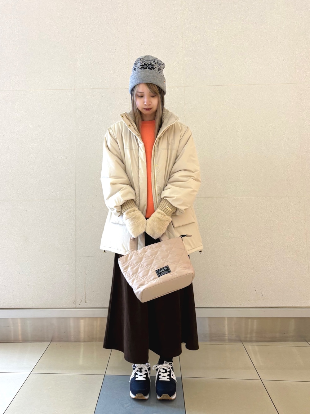 ボリューム感のあるアウターも落ち感のあるブラウンスカートを合わせることでバランスをとってくれます♪ ニット帽やミトン、キルティングバッグなど小物までトーンを揃えて統一感を出し、細部までこだわったコーデに!