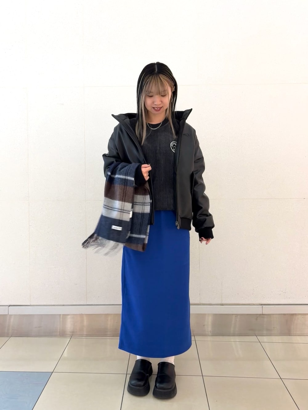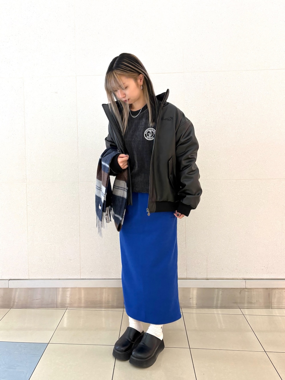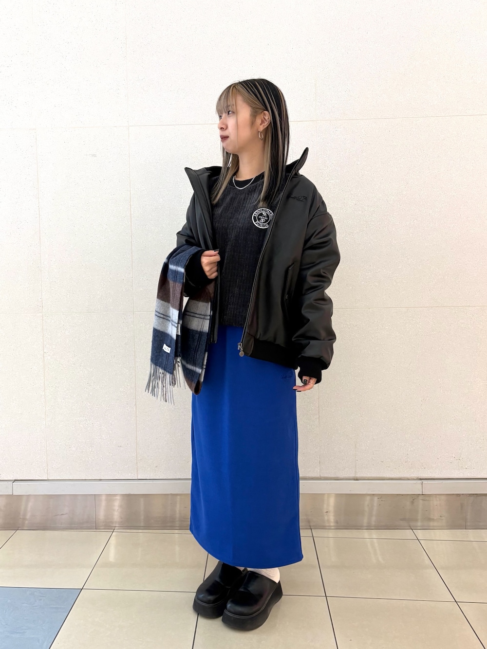 レザージャケットでかっこよさを出しつつもスカート合わせで女性らしさも兼ね備えたスーパーかっこかわいいコーデ!!!! ブルゾンの裏側は中綿キルティングになっているので防寒性もバッチリ👌✨ ひときわ目を惹くブルーのナロースカートをコーデに取り入れるのもポイントです👍