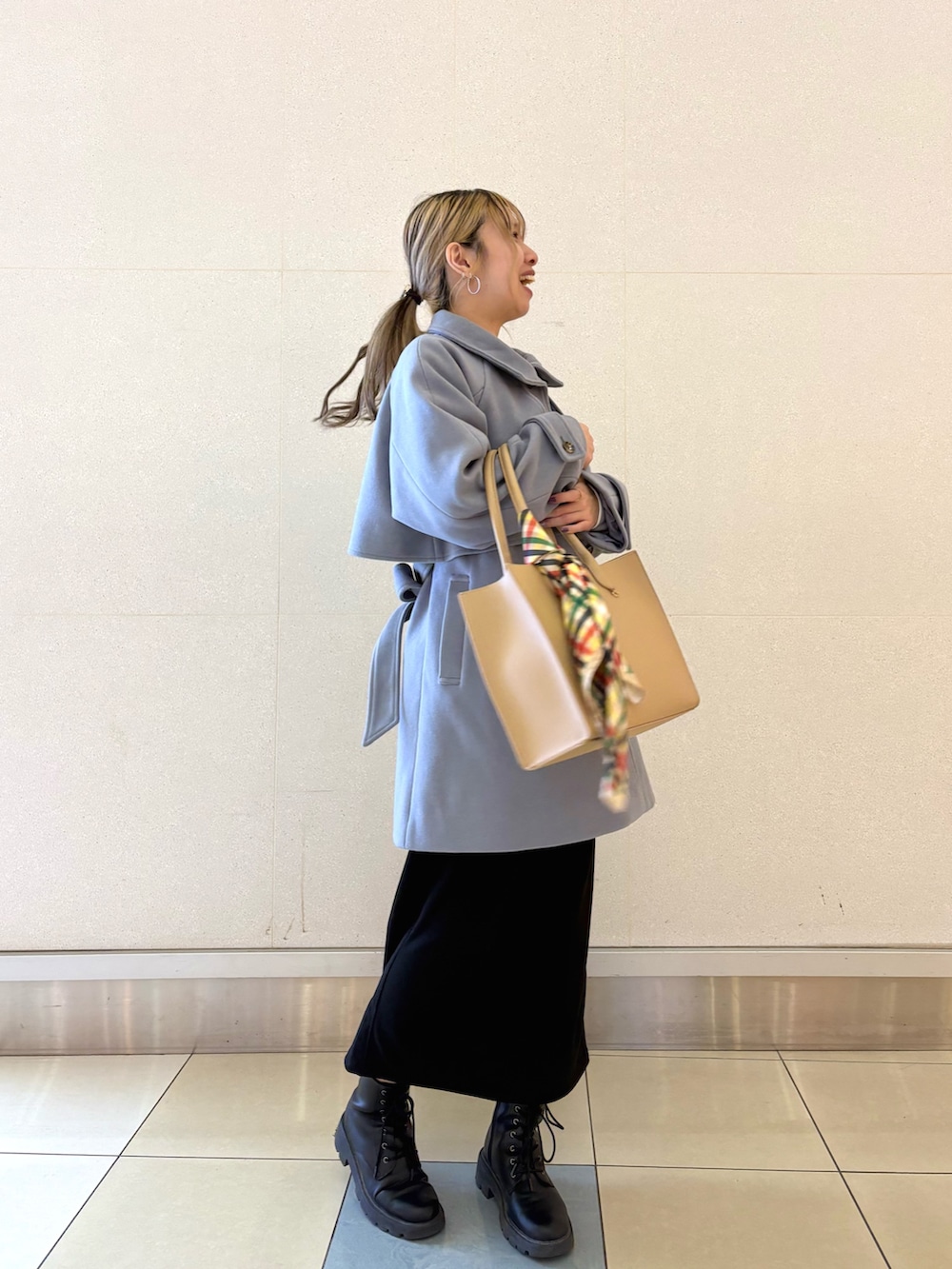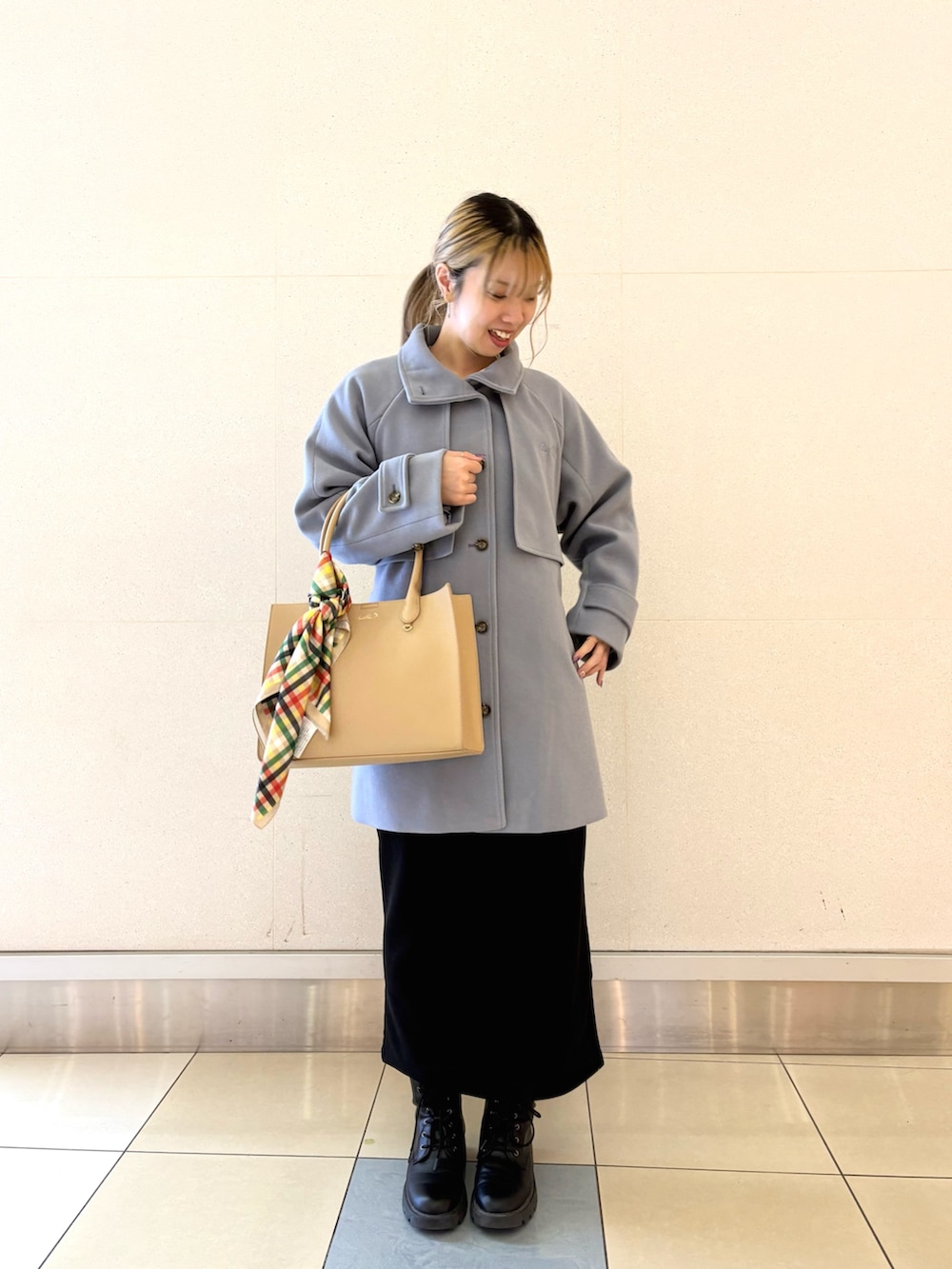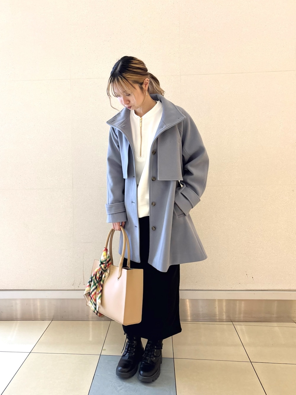 さっと羽織れて、きれいめにもカジュアルにも使えるミドル丈アウターが主役。 重たく見えないカラーなので、黒合わせでも軽い印象に✨ 通勤からお出かけまで様々なシーンで活躍すること間違いなし‼️