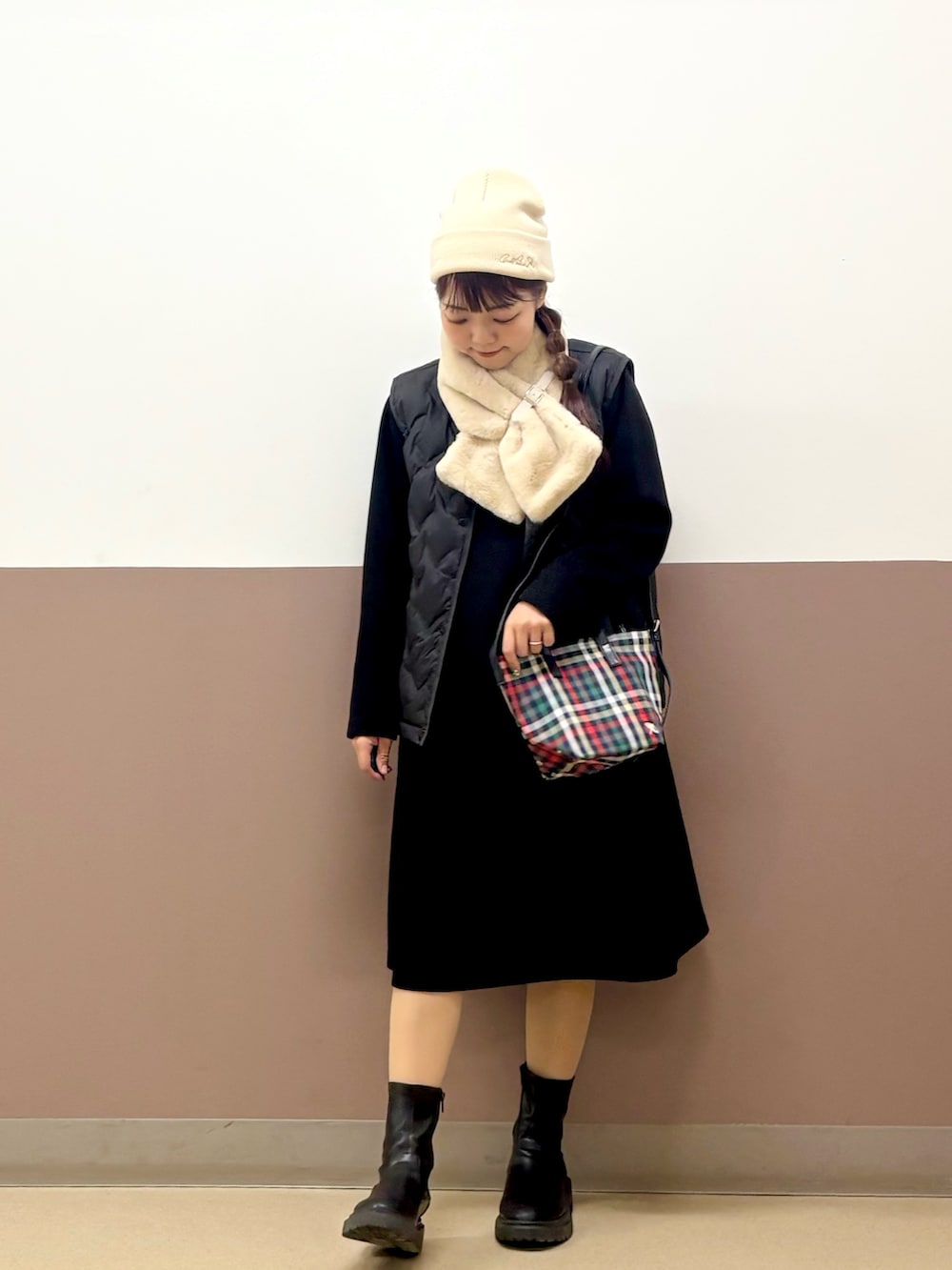 これだけもこもこなら寒さ対策もばっちり! でも抜け感は出したいのでワンピースを着てみました♪ コートの内側はバッグとお揃いのアーノルドパーマーオリジナルのチェック柄で揃えてみました◎ コートの表面はキルティングが傘柄になっており他の人と差が出る1枚★ 膝上ほどなので腰回りもしっかりあったかいです。