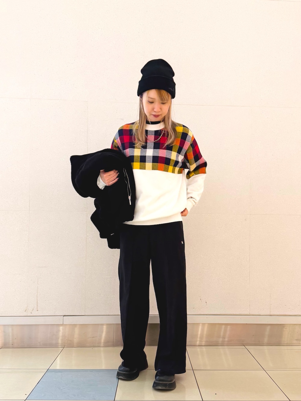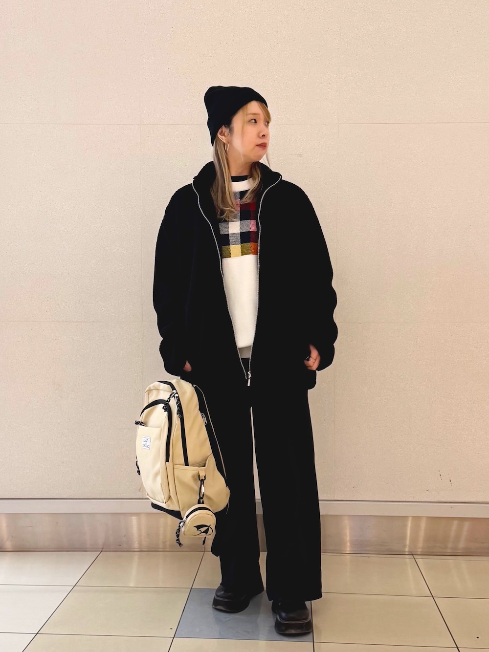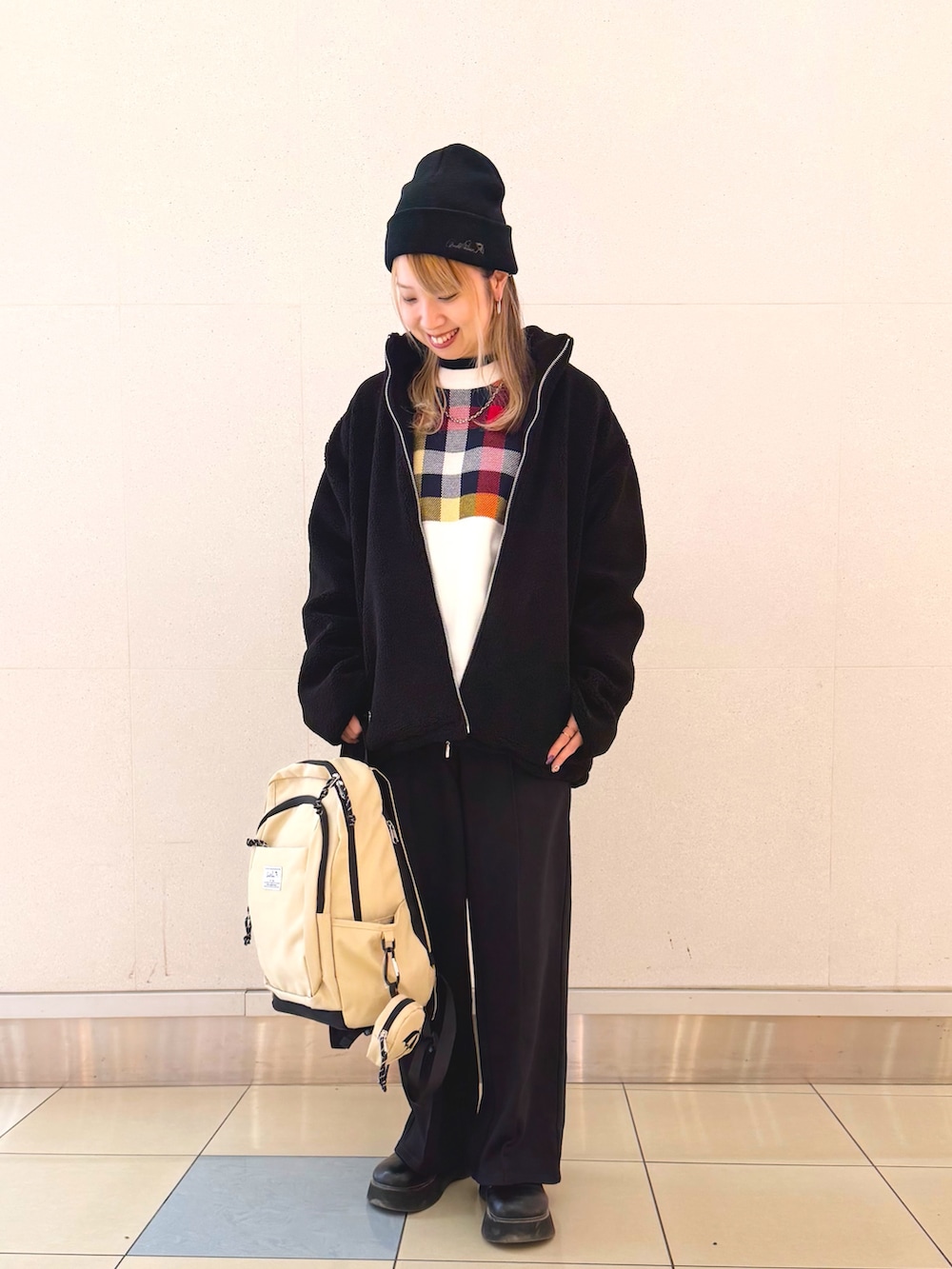 ブラックでコーデを統一し色味はシンプルながらもトップスの可愛いチェック柄が引きたつ冬のアクティブな場面で大活躍のコーデとなっております🏂!!!