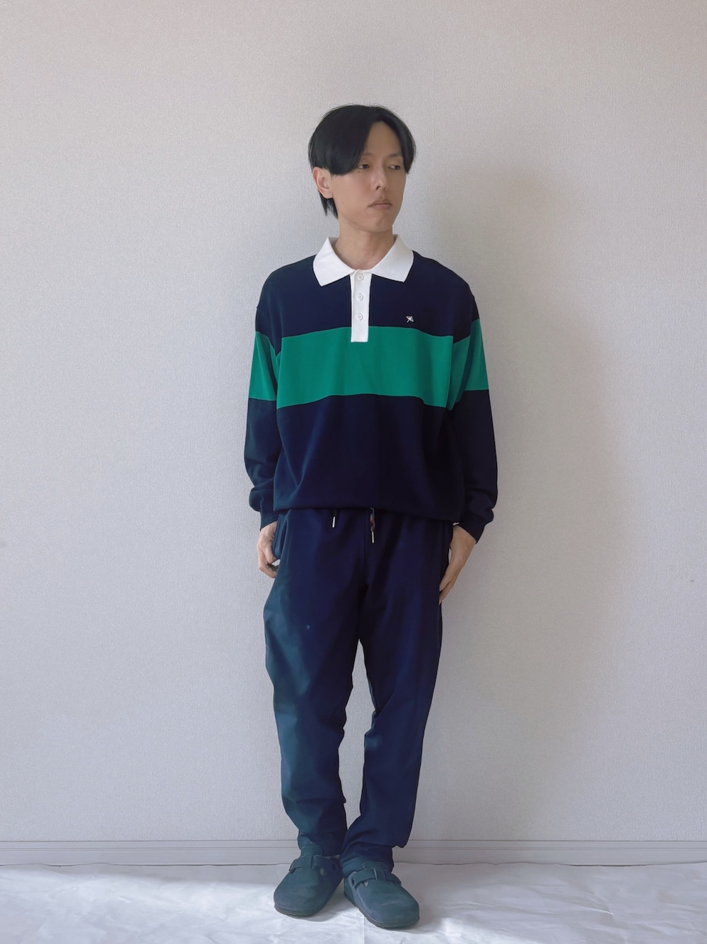 ニット素材のラガーシャツを主役にした、程よくきちんと見えするカジュアルスタイル。 襟付きデザインなのでスウェット感が出すぎず、1枚でサマになるのがポイントです。 ボトムはスウェット素材のパンツで締め付け感のないリラックスした穿き心地に。 上下ともゆったりシルエットでも、ネイビー×グリーンの配色でスッキリまとまり、こなれた印象に仕上がります。