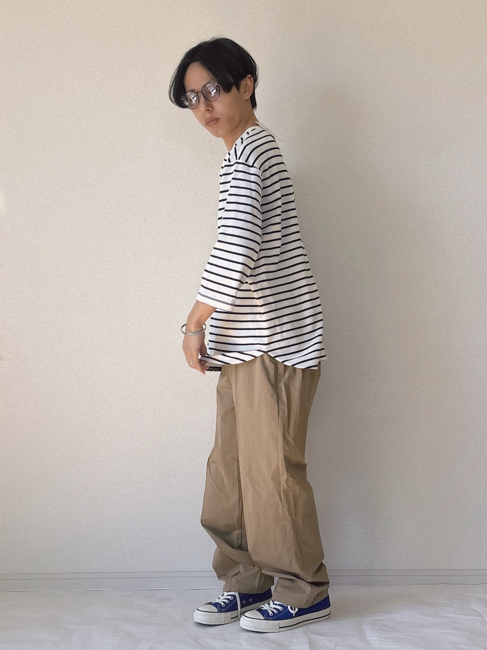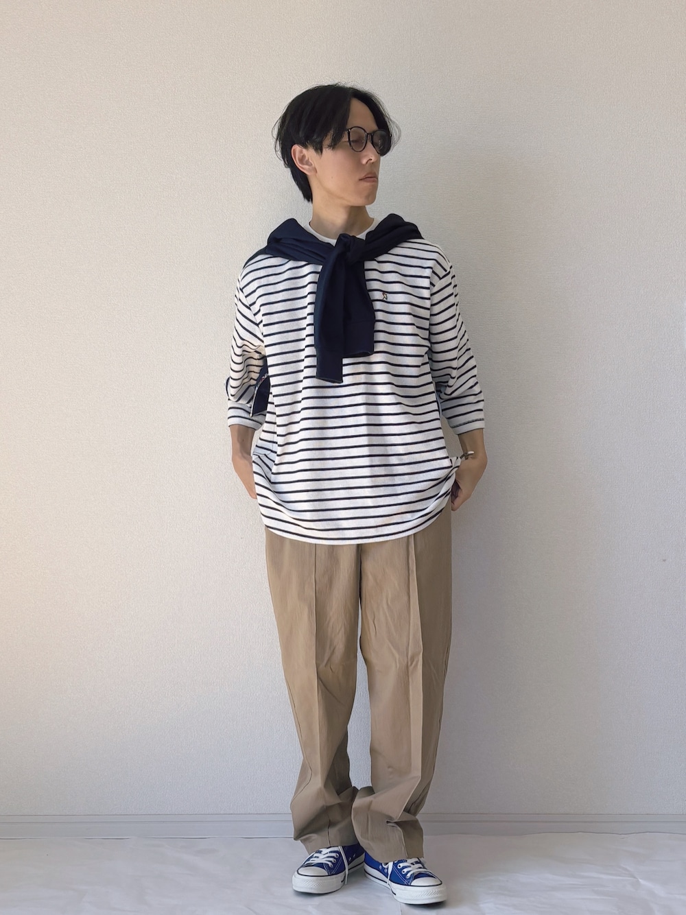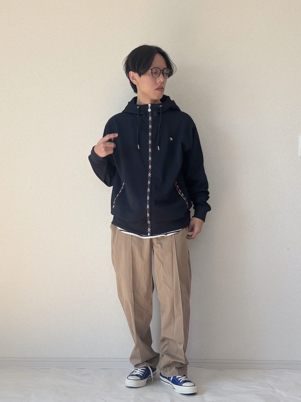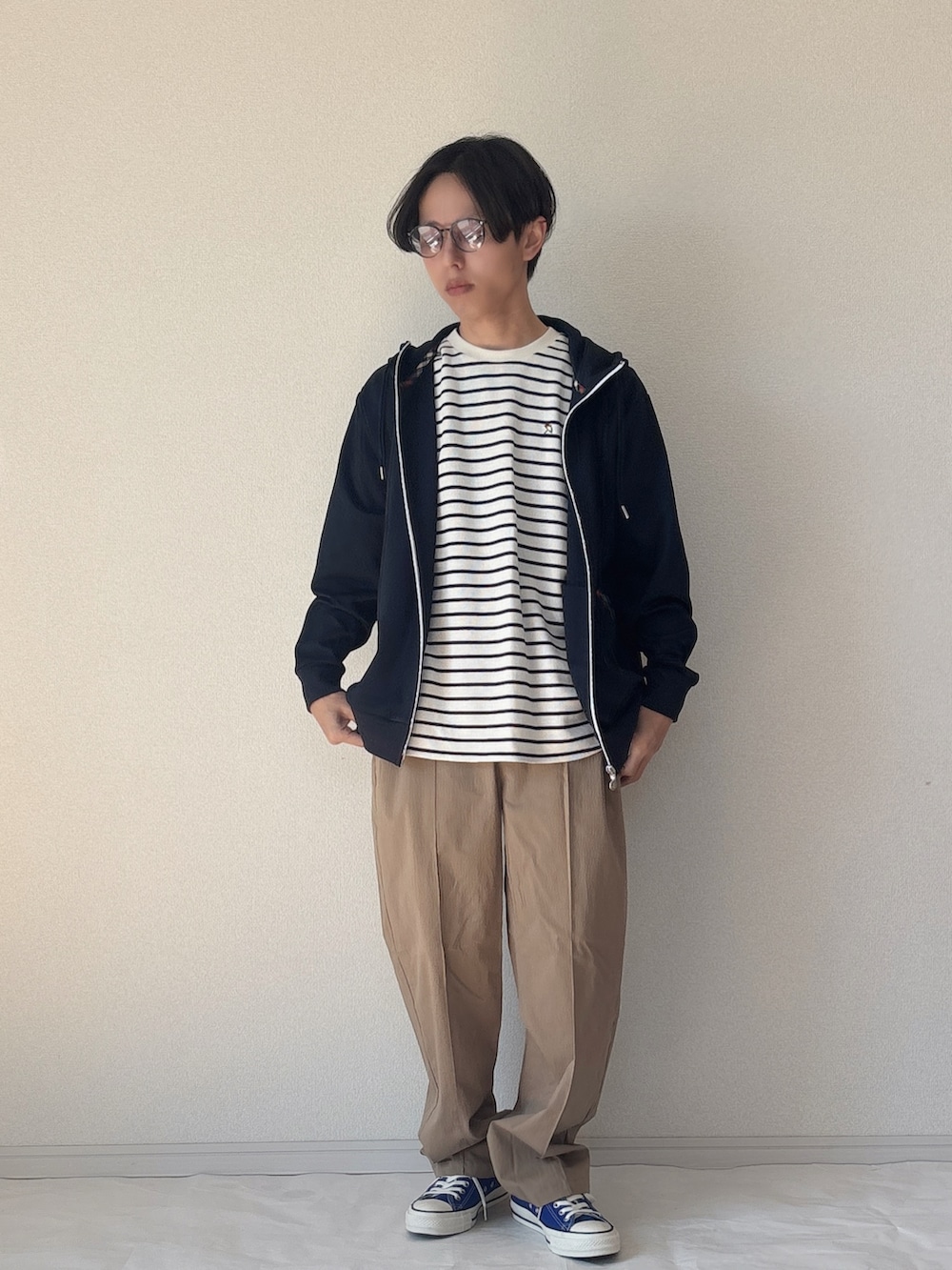 パーマーチェックが効くフルジップパーカーコーデ ファスナー部分にパーマーチェックをあしらったフルジップパーカーを主役にしたカジュアルスタイル。シンプルなデザインの中にブランドらしいアクセントが光る1枚です。 インナーには7分袖のボーダーTシャツを合わせて、軽やかで抜け感のある印象に。 ボトムはゆとりのあるワイドパンツを合わせ、リラックス感のある大人カジュアルに仕上げました。