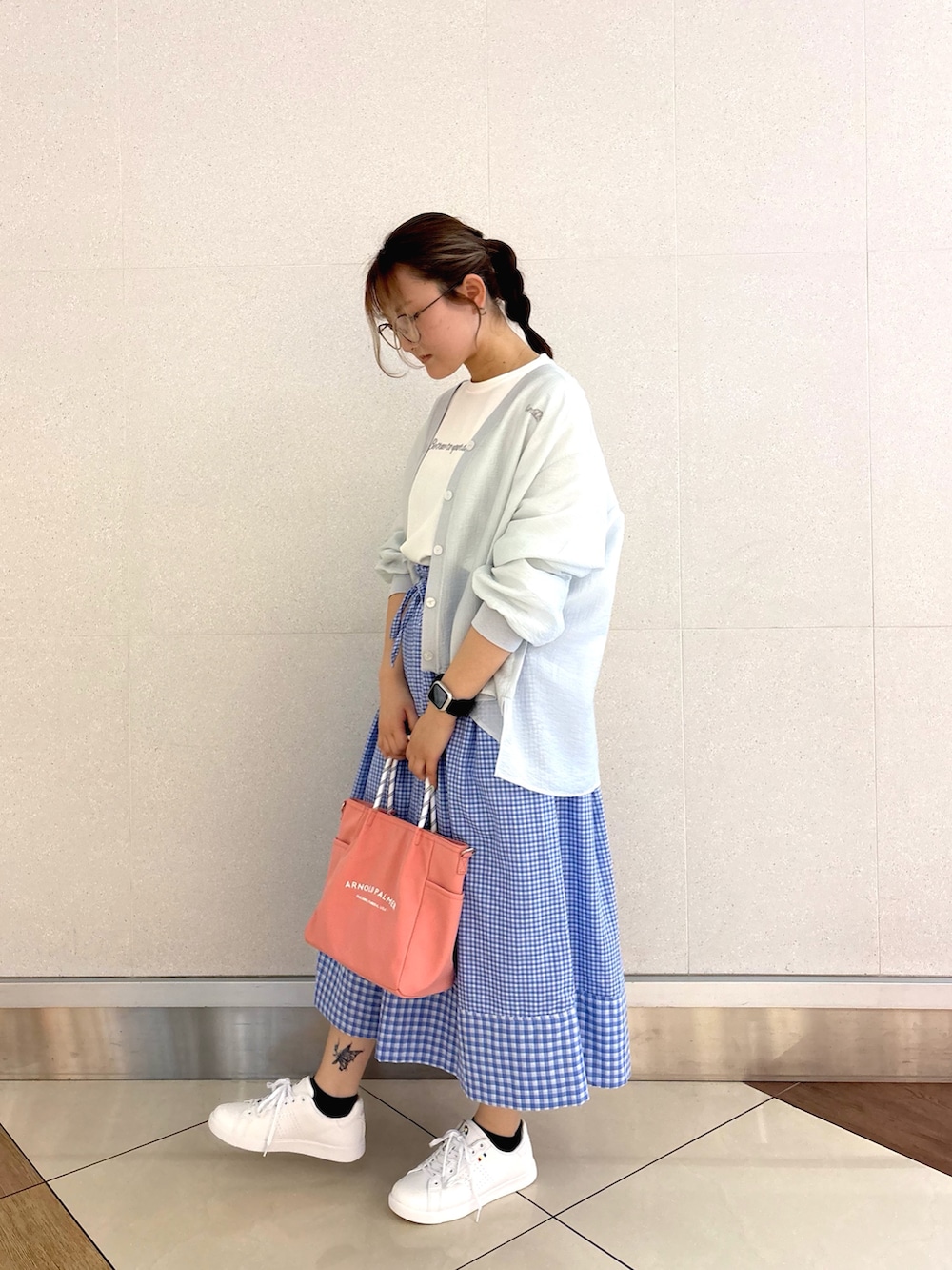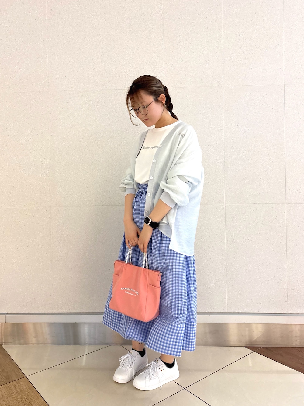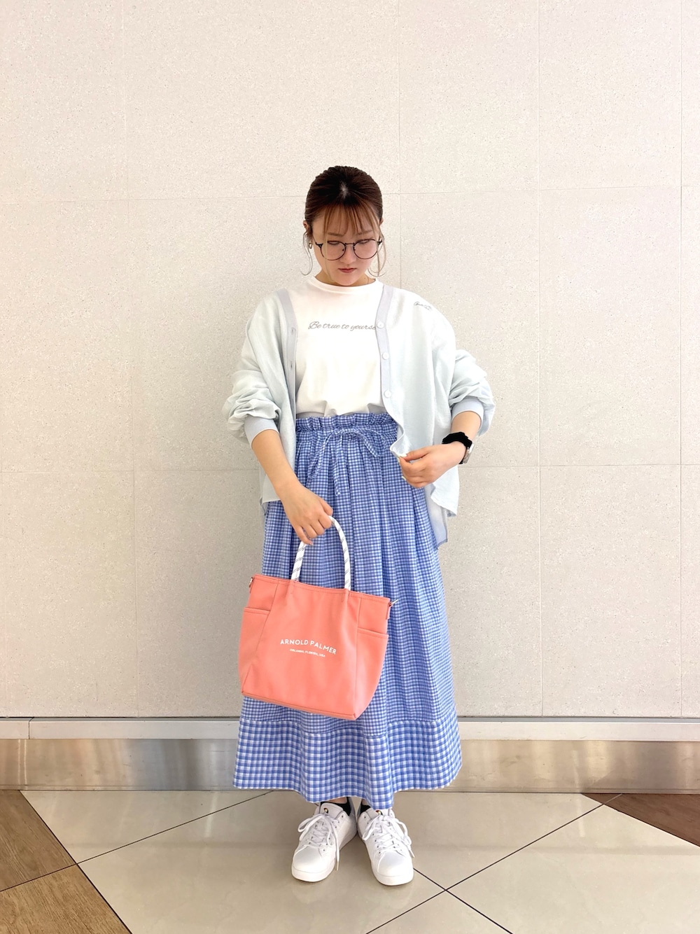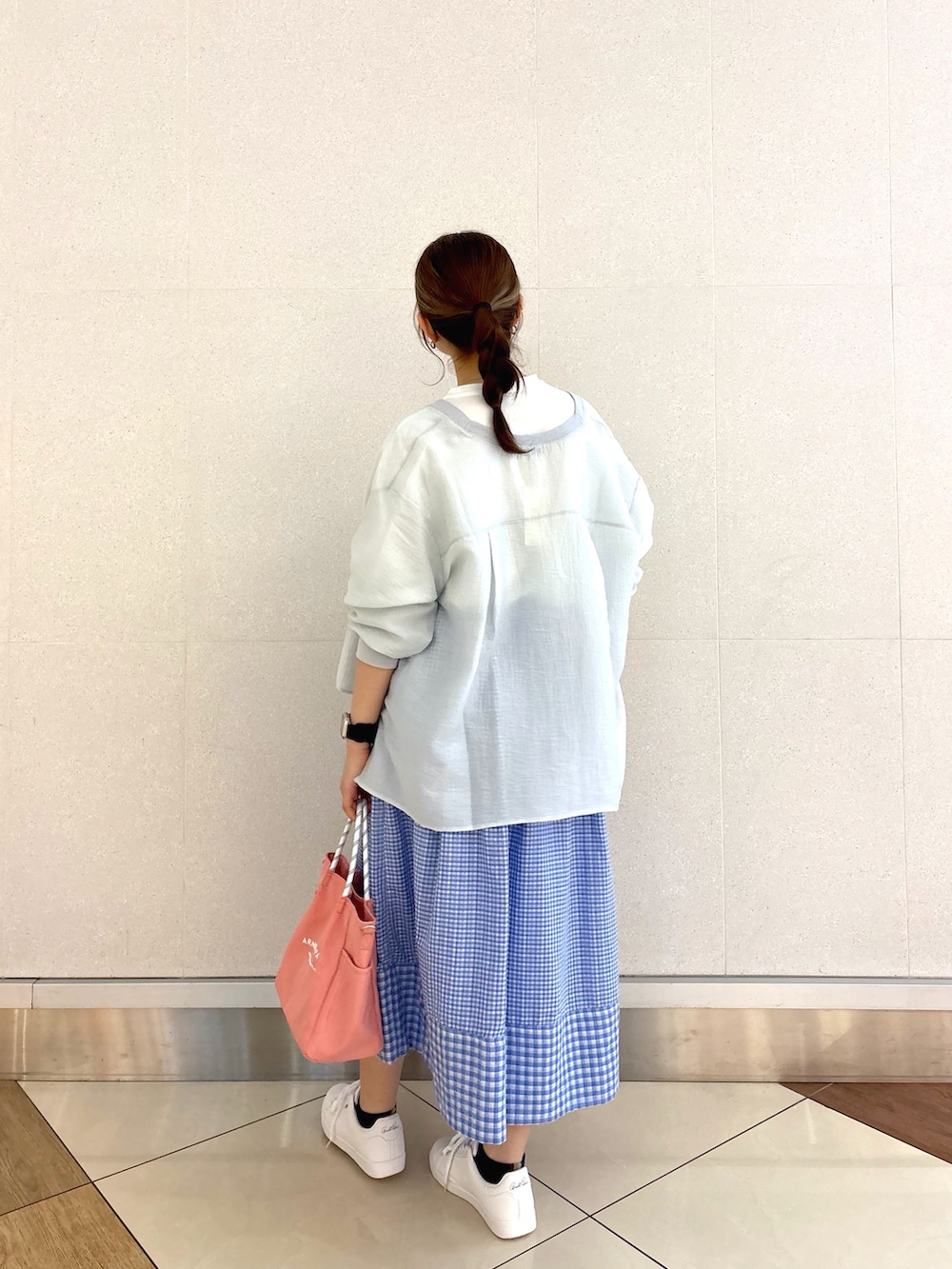 カフェ巡りやショッピングに着て行きたくなる爽やかでちょこっとガーリーなスタイル♪ 春らしい淡いブルーのギンガムチェックスカートが主役❗️ さらさら素材で着心地抜群、刺繍ロゴTとスニーカーで程よくカジュアルダウンする事で、甘すぎず大人でも着やすいコーデにしてみました^^✨
